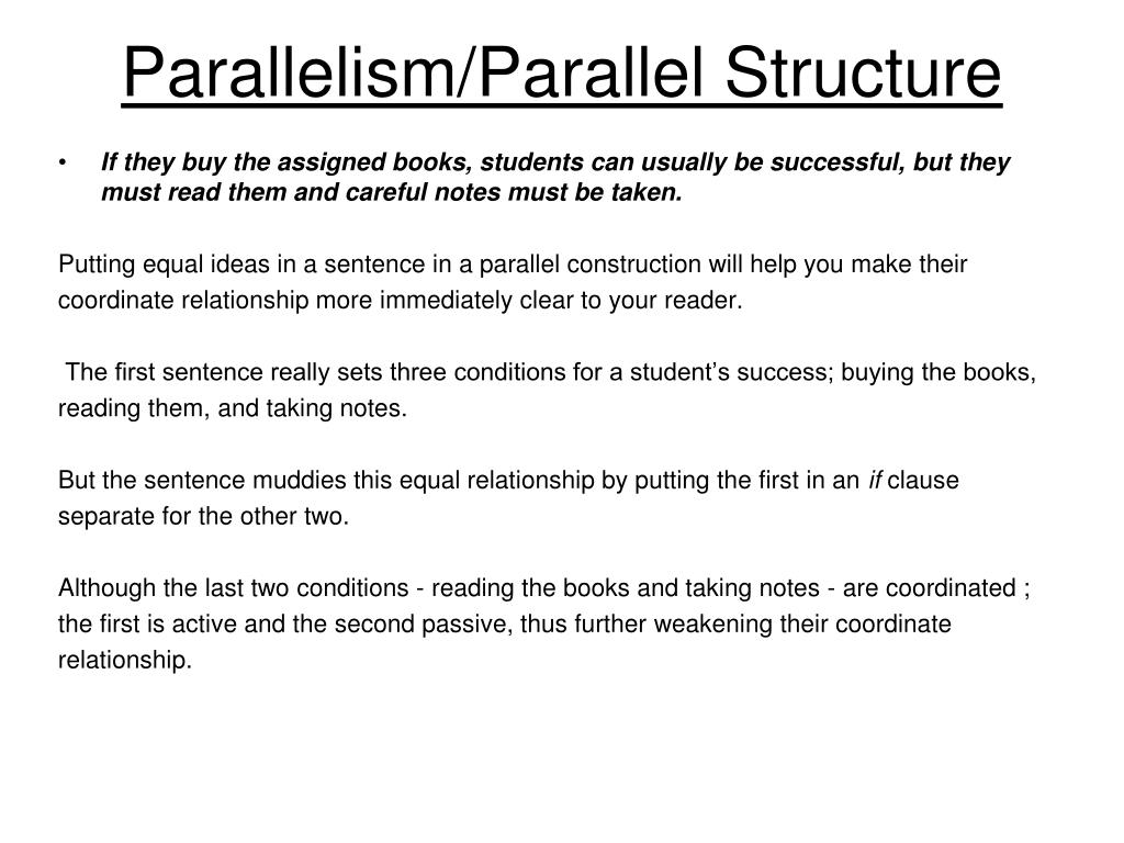 Parallelism/Parallel Structure • If they buy the assigned books, students can usually be successful, but they must read them and careful notes must be taken. Putting equal ideas in a sentence in a parallel construction will help you make their coordinate relationship more immediately clear to your reader. The first sentence really sets three conditions for a student’s success; buying the books, reading them, and taking notes. But the sentence muddies this equal relationship by putting the first in an if clause separate for the other two. Although the last two conditions - reading the books and taking notes - are coordinated ; the first is active and the second passive, thus further weakening their coordinate relationship.