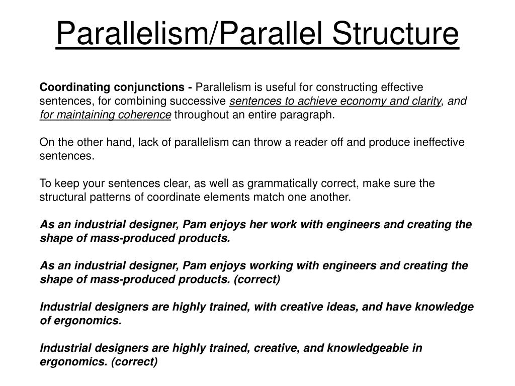 Parallelism/Parallel Structure Coordinating conjunctions - Parallelism is useful for constructing effective sentences, for combining successive sentences to achieve economy and clarity, and for maintaining coherencethroughout an entire paragraph. On the other hand, lack of parallelism can throw a reader off and produce ineffective sentences. To keep your sentences clear, as well as grammatically correct, make sure the structural patterns of coordinate elements match one another. As an industrial designer, Pam enjoys her work with engineers and creating the shape of mass-produced products. As an industrial designer, Pam enjoys working with engineers and creating the shape of mass-produced products. (correct) Industrial designers are highly trained, with creative ideas, and have knowledge of ergonomics. Industrial designers are highly trained, creative, and knowledgeable in ergonomics. (correct)
