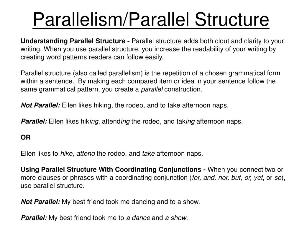 Parallelism/Parallel Structure Understanding Parallel Structure - Parallel structure adds both clout and clarity to your writing. When you use parallel structure, you increase the readability of your writing by creating word patterns readers can follow easily. Parallel structure (also called parallelism) is the repetition of a chosen grammatical form within a sentence. By making each compared item or idea in your sentence follow the same grammatical pattern, you create a parallel construction. Not Parallel: Ellen likes hiking, the rodeo, and to take afternoon naps. Parallel: Ellen likes hiking, attending the rodeo, and taking afternoon naps. OR Ellen likes to hike, attend the rodeo, and take afternoon naps. Using Parallel Structure With Coordinating Conjunctions - When you connect two or more clauses or phrases with a coordinating conjunction (for, and, nor, but, or, yet, or so), use parallel structure. Not Parallel: My best friend took me dancing and to a show. Parallel: My best friend took me to a dance and a show.