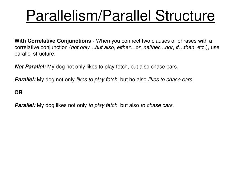 Parallelism/Parallel Structure With Correlative Conjunctions - When you connect two clauses or phrases with a correlative conjunction (not only…but also, either…or, neither…nor, if…then, etc.), use parallel structure. Not Parallel: My dog not only likes to play fetch, but also chase cars. Parallel: My dog not only likes to play fetch, but he also likes to chase cars. OR Parallel: My dog likes not only to play fetch, but also to chase cars.