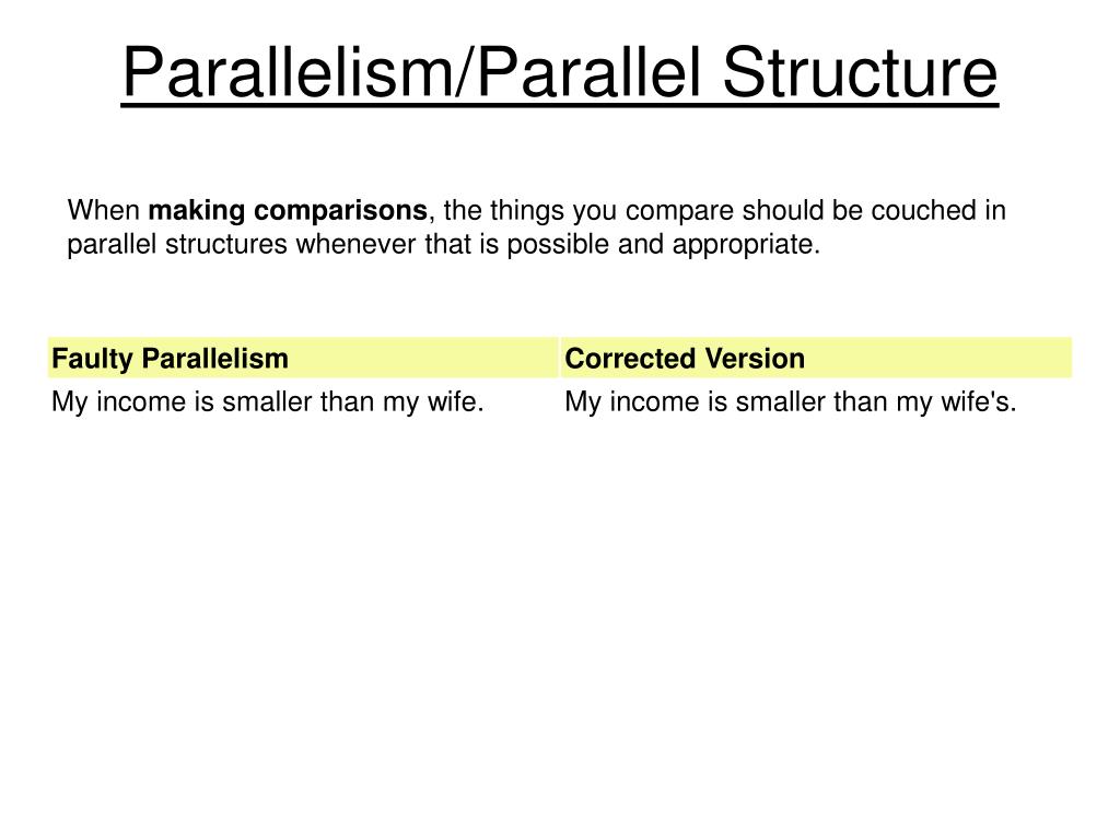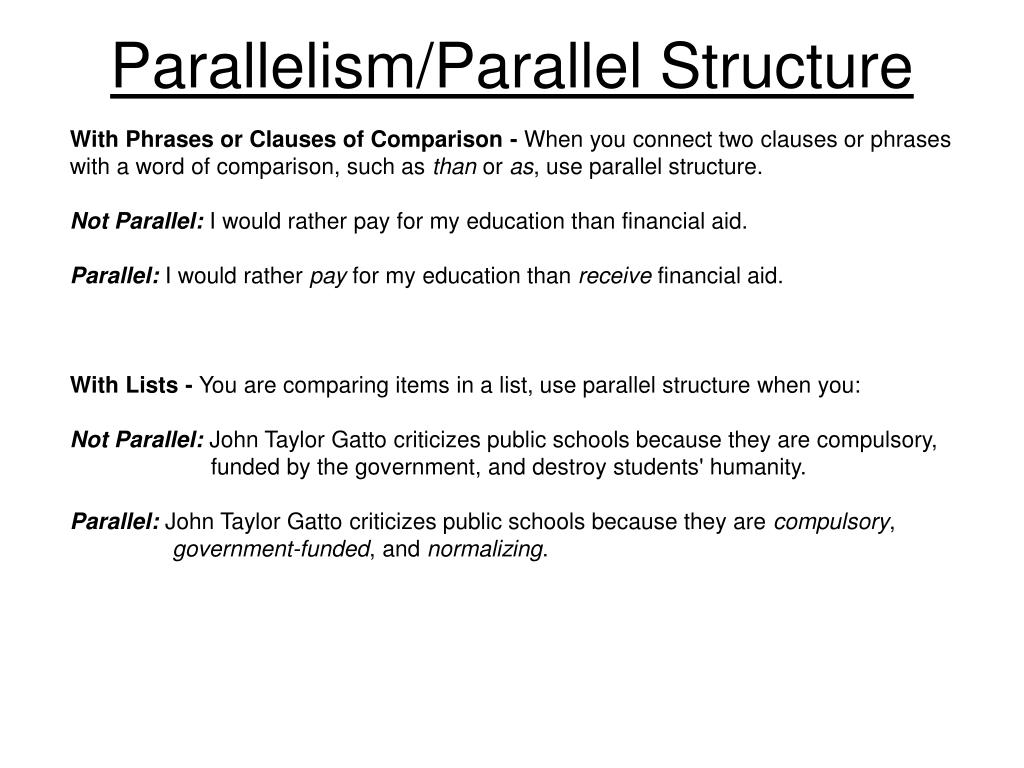 Parallelism/Parallel Structure With Phrases or Clauses of Comparison - When you connect two clauses or phrases with a word of comparison, such as than or as, use parallel structure. Not Parallel: I would rather pay for my education than financial aid. Parallel: I would rather pay for my education than receive financial aid. With Lists - You are comparing items in a list, use parallel structure when you: Not Parallel: John Taylor Gatto criticizes public schools because they are compulsory, funded by the government, and destroy students' humanity. Parallel: John Taylor Gatto criticizes public schools because they are compulsory, government-funded, and normalizing.