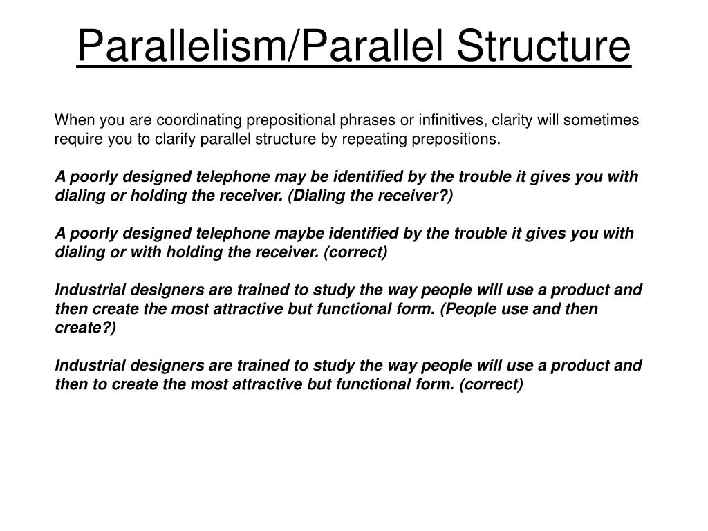 Parallelism/Parallel Structure When you are coordinating prepositional phrases or infinitives, clarity will sometimes require you to clarify parallel structure by repeating prepositions. A poorly designed telephone may be identified by the trouble it gives you with dialing or holding the receiver. (Dialing the receiver?) A poorly designed telephone maybe identified by the trouble it gives you with dialing or with holding the receiver. (correct) Industrial designers are trained to study the way people will use a product and then create the most attractive but functional form. (People use and then create?) Industrial designers are trained to study the way people will use a product and then to create the most attractive but functional form. (correct)