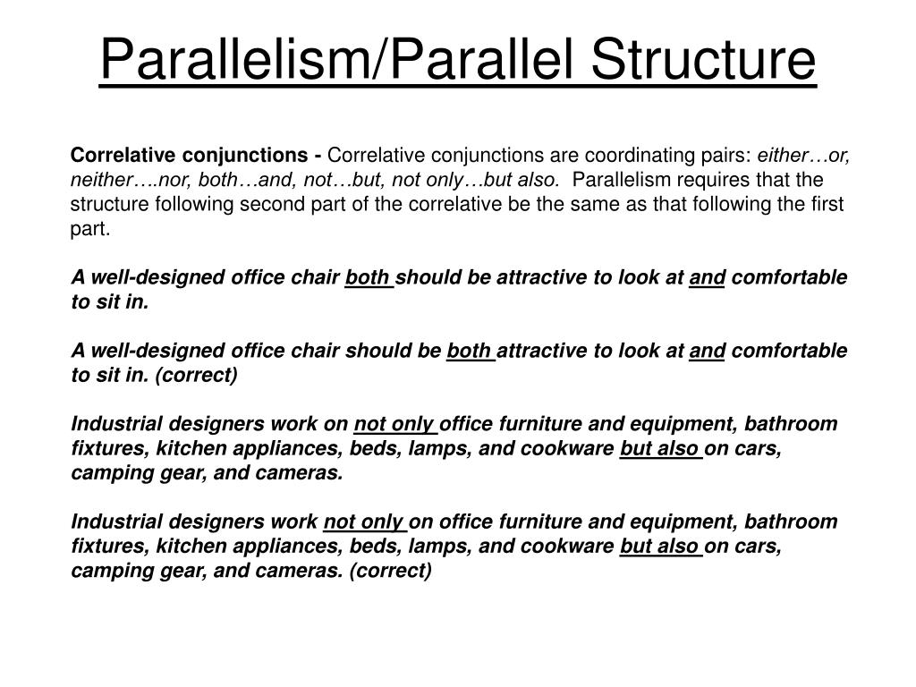 Parallelism/Parallel Structure Correlative conjunctions - Correlative conjunctions are coordinating pairs: either…or, neither….nor, both…and, not…but, not only…but also. Parallelism requires that the structure following second part of the correlative be the same as that following the first part. A well-designed office chair both should be attractive to look at and comfortable to sit in. A well-designed office chair should be both attractive to look at and comfortable to sit in. (correct) Industrial designers work on not only office furniture and equipment, bathroom fixtures, kitchen appliances, beds, lamps, and cookware but also on cars, camping gear, and cameras. Industrial designers work not only on office furniture and equipment, bathroom fixtures, kitchen appliances, beds, lamps, and cookware but also on cars, camping gear, and cameras. (correct)