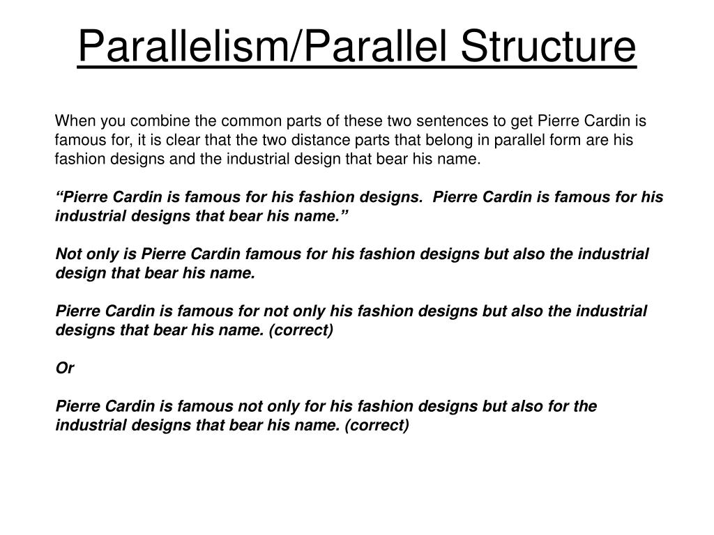 Parallelism/Parallel Structure When you combine the common parts of these two sentences to get Pierre Cardin is famous for, it is clear that the two distance parts that belong in parallel form are his fashion designs and the industrial design that bear his name. “Pierre Cardin is famous for his fashion designs. Pierre Cardin is famous for his industrial designs that bear his name.” Not only is Pierre Cardin famous for his fashion designs but also the industrial design that bear his name. Pierre Cardin is famous for not only his fashion designs but also the industrial designs that bear his name. (correct) Or Pierre Cardin is famous not only for his fashion designs but also for the industrial designs that bear his name. (correct)