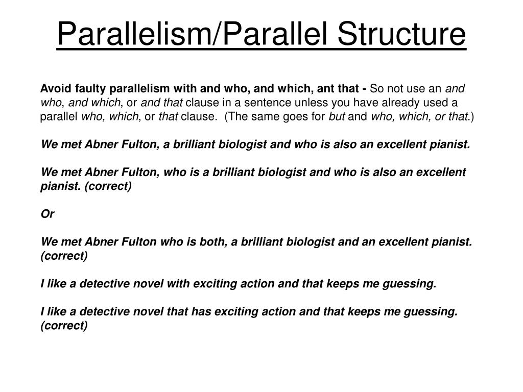 Parallelism/Parallel Structure Avoid faulty parallelism with and who, and which, ant that - So not use an and who, and which, or and that clause in a sentence unless you have already used a parallel who, which, or that clause. (The same goes for but and who, which, or that.) We met Abner Fulton, a brilliant biologist and who is also an excellent pianist. We met Abner Fulton, who is a brilliant biologist and who is also an excellent pianist. (correct) Or We met Abner Fulton who is both, a brilliant biologist and an excellent pianist. (correct) I like a detective novel with exciting action and that keeps me guessing. I like a detective novel that has exciting action and that keeps me guessing. (correct)