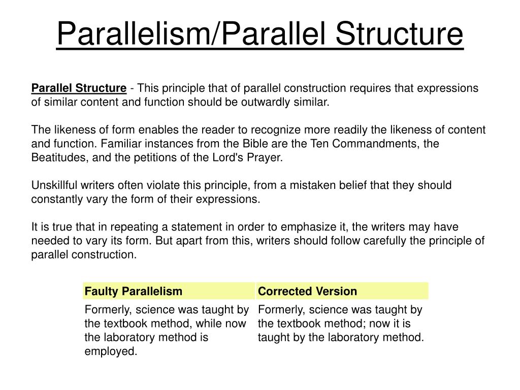 Parallelism/Parallel Structure Parallel Structure - This principle that of parallel construction requires that expressions of similar content and function should be outwardly similar. The likeness of form enables the reader to recognize more readily the likeness of content and function. Familiar instances from the Bible are the Ten Commandments, the Beatitudes, and the petitions of the Lord's Prayer. Unskillful writers often violate this principle, from a mistaken belief that they should constantly vary the form of their expressions. It is true that in repeating a statement in order to emphasize it, the writers may have needed to vary its form. But apart from this, writers should follow carefully the principle of parallel construction.