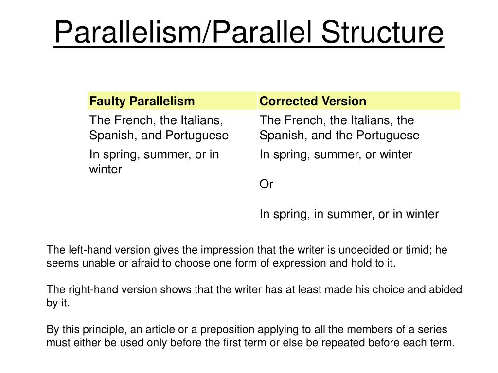 Parallelism/Parallel Structure The left-hand version gives the impression that the writer is undecided or timid; he seems unable or afraid to choose one form of expression and hold to it. The right-hand version shows that the writer has at least made his choice and abided by it. By this principle, an article or a preposition applying to all the members of a series must either be used only before the first term or else be repeated before each term.
