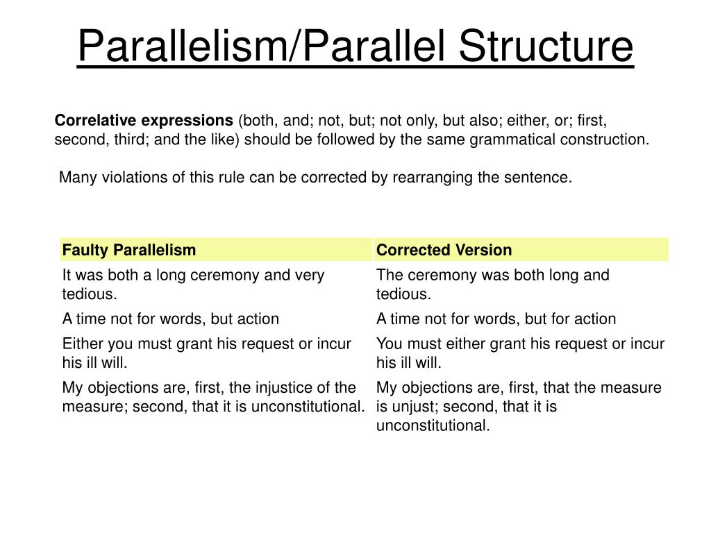 Parallelism/Parallel Structure Correlative expressions (both, and; not, but; not only, but also; either, or; first, second, third; and the like) should be followed by the same grammatical construction. Many violations of this rule can be corrected by rearranging the sentence.