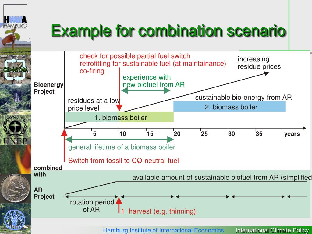 check for possible partial fuel switch increasing retrofitting for sustainable fuel (at maintainance) residue prices co-firing experience with new biofuel from AR Bioenergy Project sustainable bio-energy from AR residues at a low 2. biomass boiler price level 1. biomass boiler 5 10 15 20 25 30 35 years general lifetime of a biomass boiler Switch from fossil to CO-neutral fuel 2 combined with available amount of sustainable biofuel from AR (simplified) AR Project rotation period of AR 1. harvest (e.g. thinning) Example for combination scenario