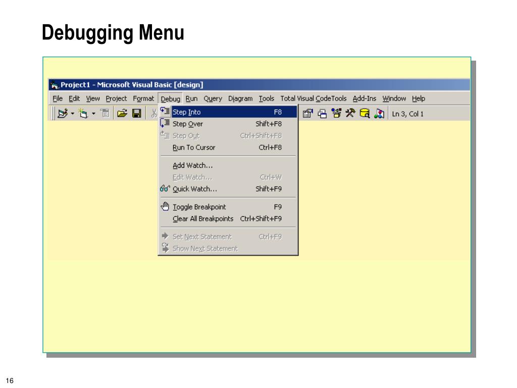 Overview • Types of Errors • Debugging Terms • Debugging Code in Visual Basic • Using the Call Stack • Using Watch Variables to Monitor Program Execution • Using the Locals Window
