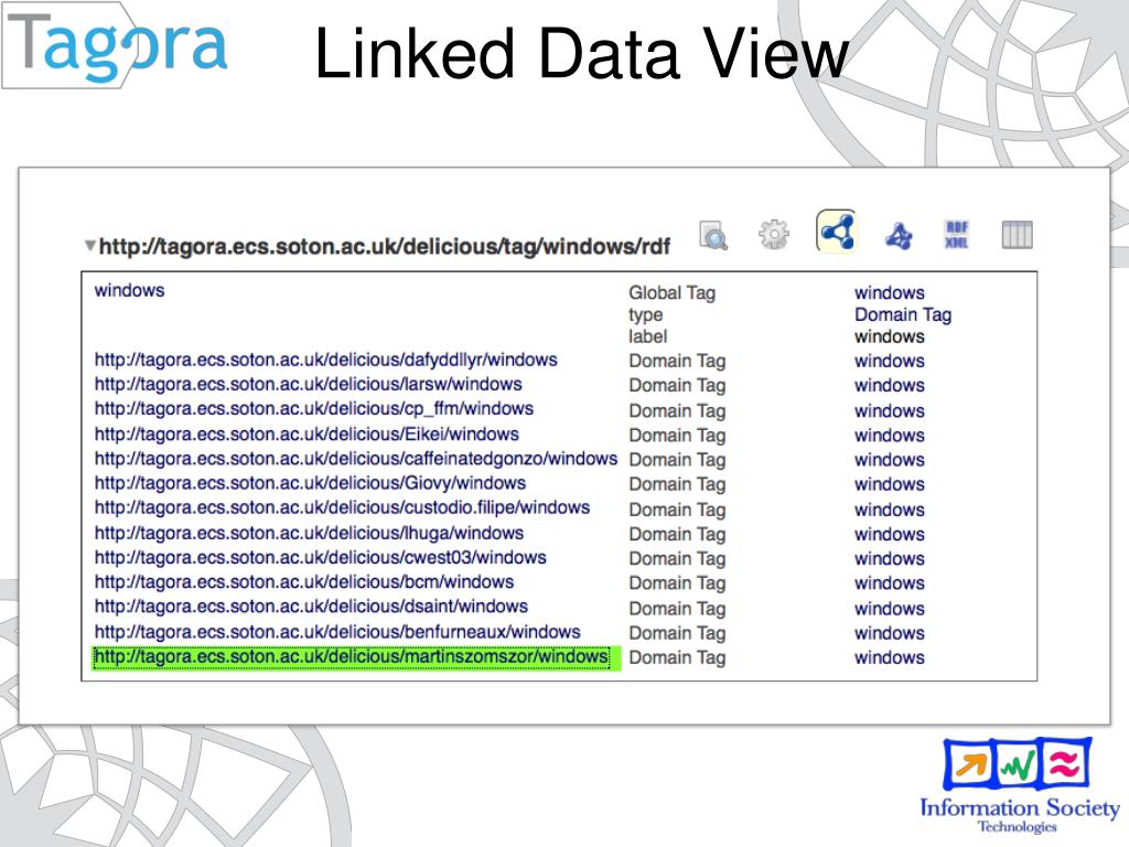 http://tagora.ecs.soton.ac.uk/tag/apple dbpedia:hasDbpediaSenseInfo http://tagora.ecs.soton.ac.uk/tag/apple/sense-info/0 dbpedia:sense dbpedia:senseWeight 0.30628910807 http://tagora.ecs.soton.ac.uk/dbpedia/resource/Apple_Inc. owl:sameAs dbpedia:hasTermFrequency dbpedia:hasTermFrequencyPair “mac” _:b9510f00000000a5 35 dbpedia:hasTerm http://tagora.ecs.soton.ac.uk/tag/apple/sense-info/1 dbpedia:sense dbpedia:senseWeight 0.248912928 http://tagora.ecs.soton.ac.uk/dbpedia/resource/Apple owl:sameAs dbpedia:hasTermFrequency dbpedia:hasTermFrequencyPair “fruit” _:b9510f00000000a5 41 dbpedia:hasTerm