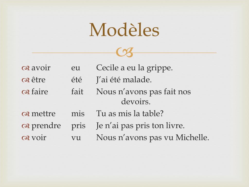 Modèles • avoireu Cecile a eu la grippe. • être été J’ai étémalade. • faire fait Nous n’avons pas fait nos devoirs. • mettremis Tu as mis la table? • prendrepris Je n’ai pas pris ton livre. • voir vu Nous n’avons pas vu Michelle.