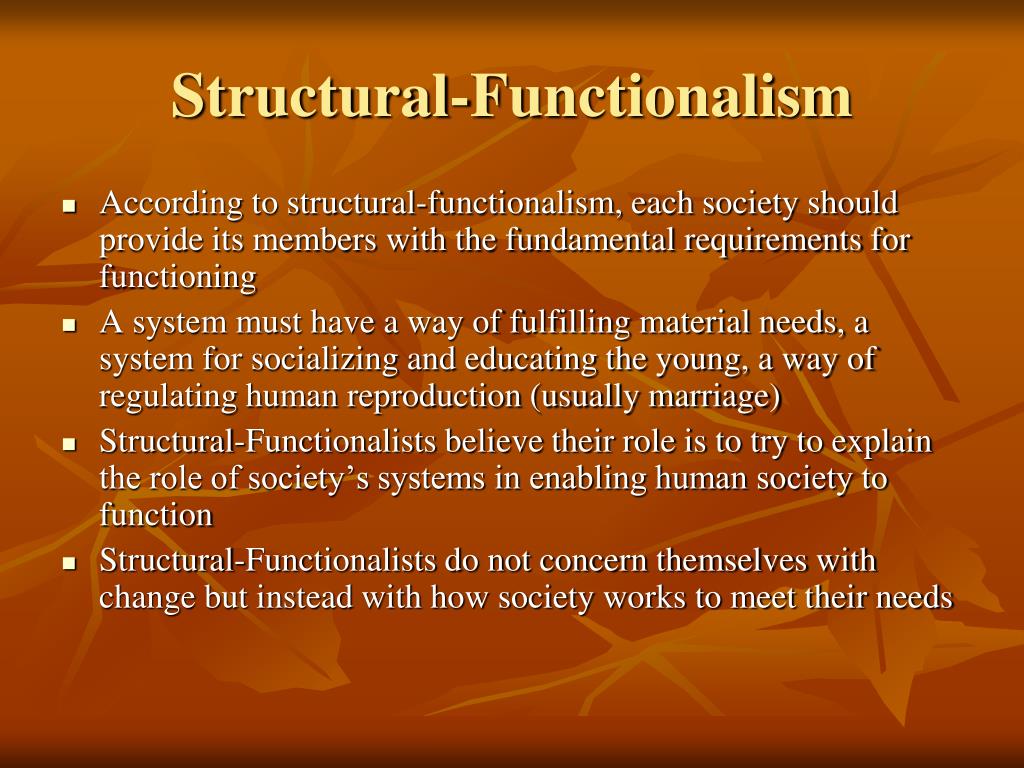 Structural-Functionalism According to structural-functionalism, each society should provide its members with the fundamental requirements for functioning A system must have a way of fulfilling material needs, a system for socializing and educating the young, a way of regulating human reproduction (usually marriage) Structural-Functionalists believe their role is to try to explain the role of society’s systems in enabling human society to function Structural-Functionalists do not concern themselves with change but instead with how society works to meet their needs