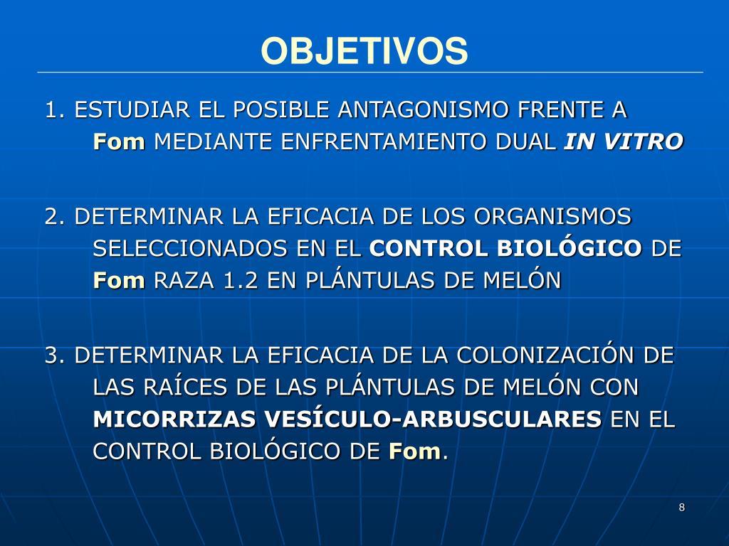 OBJETIVOS 1. ESTUDIAR EL POSIBLE ANTAGONISMO FRENTE A FomMEDIANTE ENFRENTAMIENTO DUAL IN VITRO 2. DETERMINAR LA EFICACIA DE LOS ORGANISMOS SELECCIONADOS EN EL CONTROL BIOLÓGICO DE FomRAZA 1.2 EN PLÁNTULAS DE MELÓN 3. DETERMINAR LA EFICACIA DE LA COLONIZACIÓN DE LAS RAÍCES DE LAS PLÁNTULAS DE MELÓN CON MICORRIZAS VESÍCULO-ARBUSCULARES EN EL CONTROL BIOLÓGICO DE Fom.