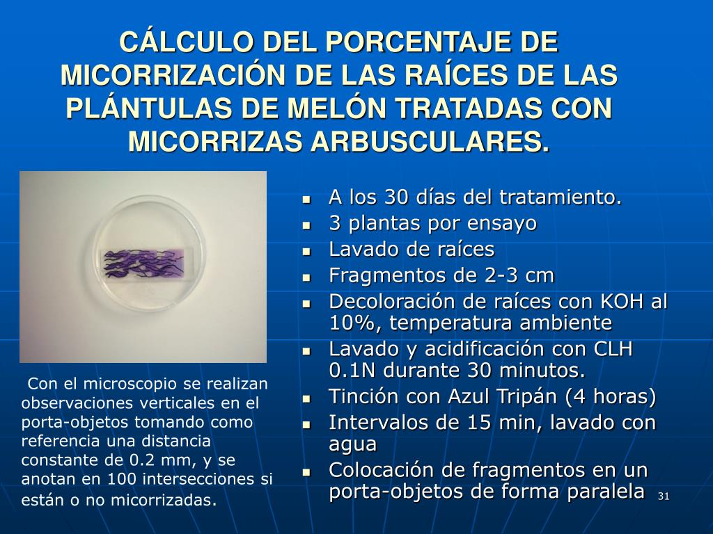 CÁLCULO DEL PORCENTAJE DE MICORRIZACIÓN DE LAS RAÍCES DE LAS PLÁNTULAS DE MELÓN TRATADAS CON MICORRIZAS ARBUSCULARES. • A los 30 días del tratamiento. • 3 plantas por ensayo • Lavado de raíces • Fragmentos de 2-3 cm • Decoloración de raíces con KOH al 10%, temperatura ambiente • Lavado y acidificación con CLH 0.1N durante 30 minutos. • Tinción con Azul Tripán (4 horas) • Intervalos de 15 min, lavado con agua • Colocación de fragmentos en un porta-objetos de forma paralela Con el microscopio se realizan observaciones verticales en el porta-objetos tomando como referencia una distancia constante de 0.2 mm, y se anotan en 100 intersecciones si están o no micorrizadas.