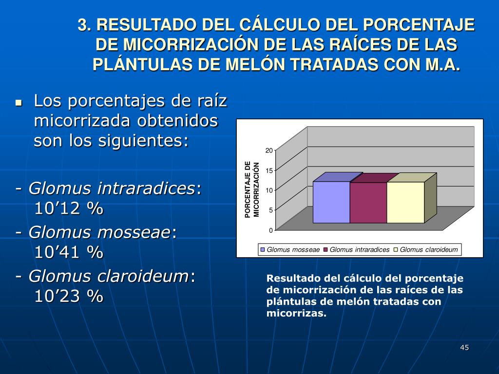 3.RESULTADO DEL CÁLCULO DEL PORCENTAJE DE MICORRIZACIÓN DE LAS RAÍCES DE LAS PLÁNTULAS DE MELÓN TRATADAS CON M.A. • Los porcentajes de raíz micorrizada obtenidos son los siguientes: - Glomus intraradices: 10’12 % - Glomus mosseae: 10’41 % - Glomus claroideum: 10’23 % Resultado del cálculo del porcentaje de micorrización de las raíces de las plántulas de melón tratadas con micorrizas.