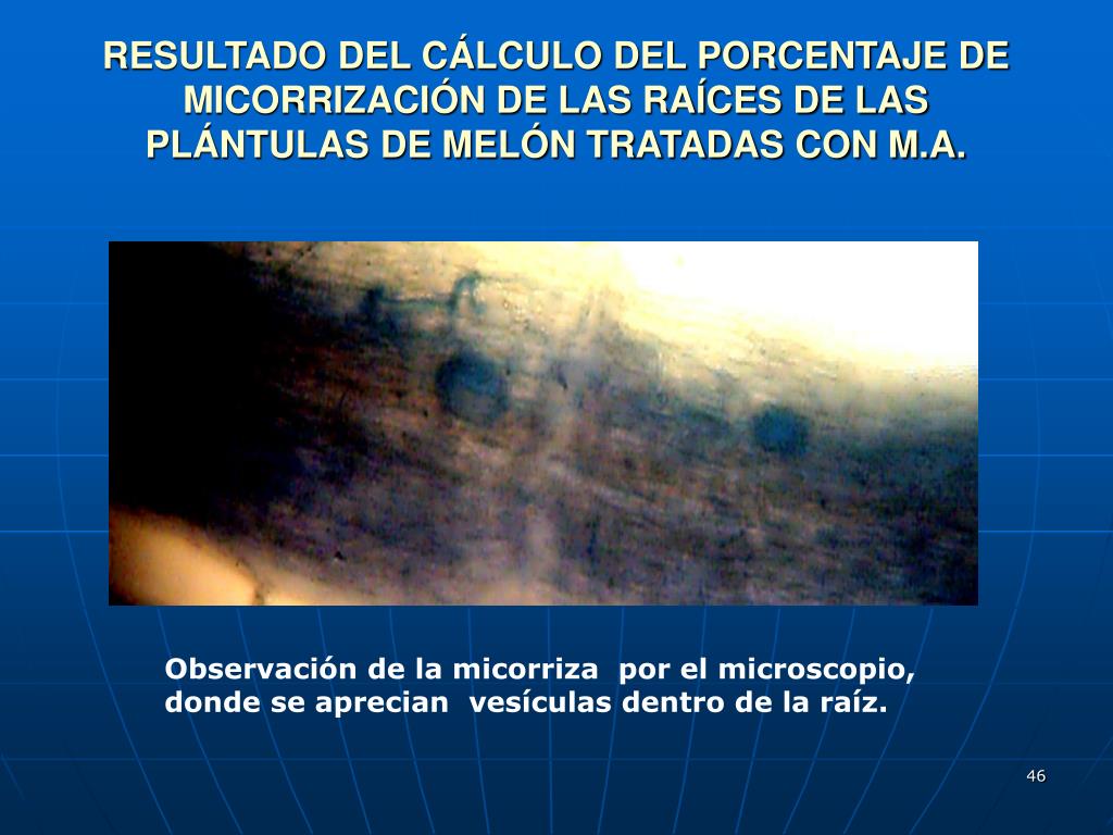 RESULTADO DEL CÁLCULO DEL PORCENTAJE DE MICORRIZACIÓN DE LAS RAÍCES DE LAS PLÁNTULAS DE MELÓN TRATADAS CON M.A. Observación de la micorriza por el microscopio, donde se aprecian vesículas dentro de la raíz.