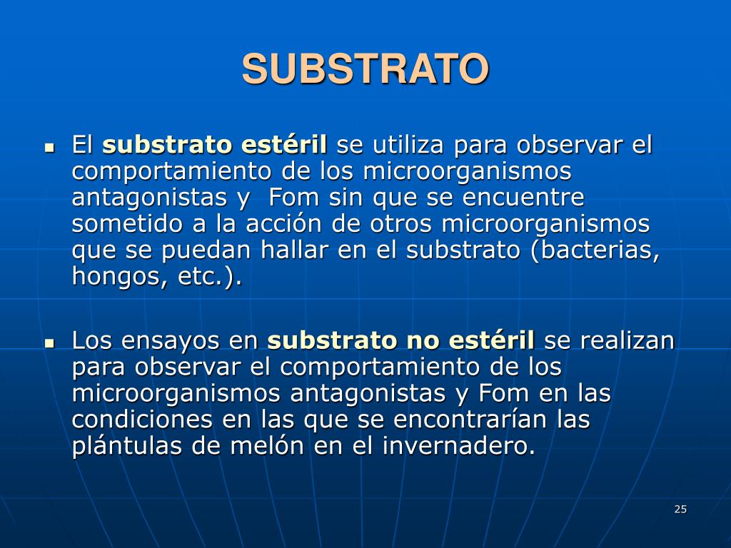 SUBSTRATO • El substrato estéril se utiliza para observar el comportamiento de los microorganismos antagonistas y Fom sin que se encuentre sometido a la acción de otros microorganismos que se puedan hallar en el substrato (bacterias, hongos, etc.). • Los ensayos en substrato no estéril se realizan para observar el comportamiento de los microorganismos antagonistas y Fom en las condiciones en las que se encontrarían las plántulas de melón en el invernadero.