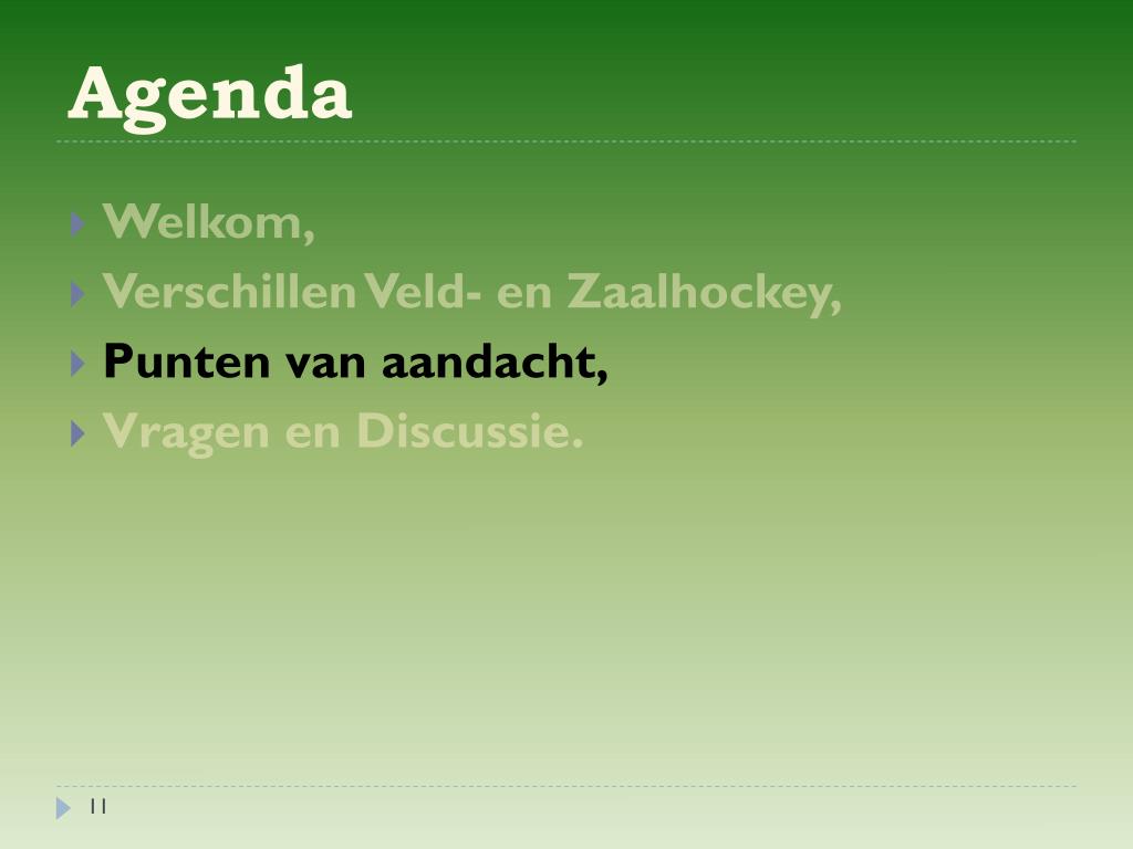 Agenda • Welkom, • Verschillen Veld- en Zaalhockey, • Punten van aandacht, • Vragen en Discussie.