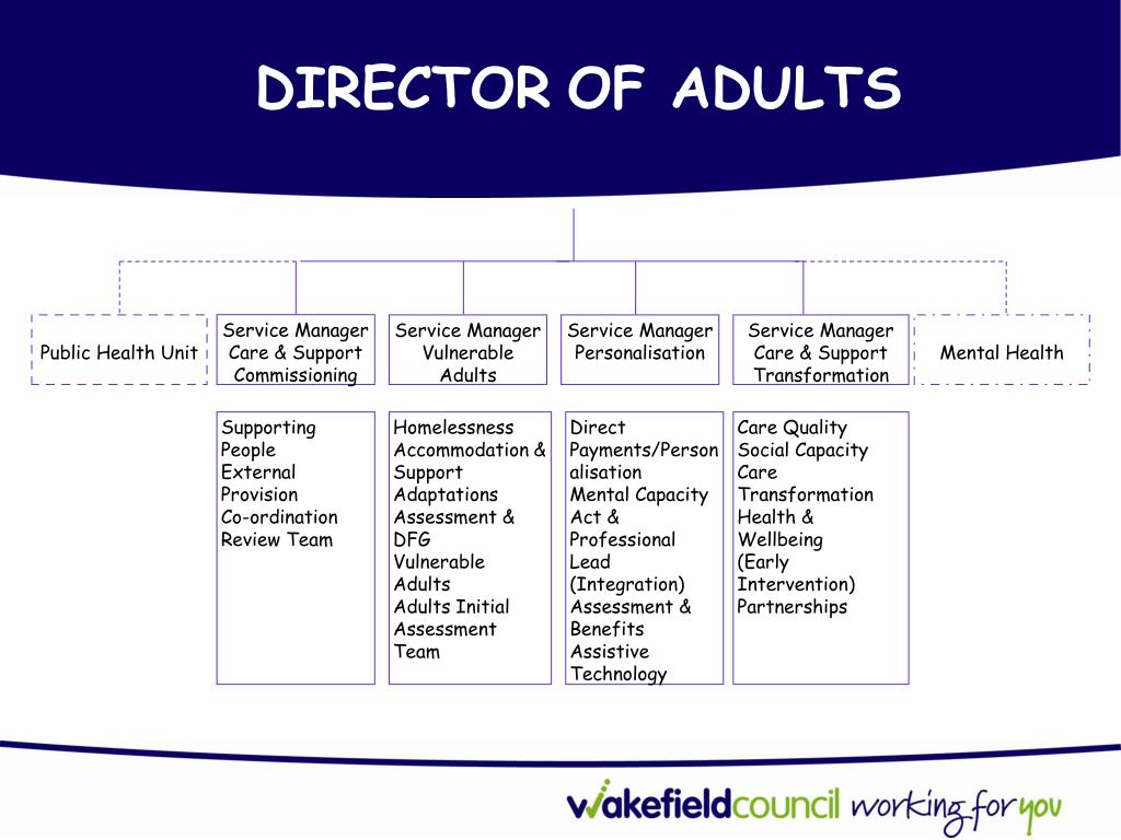 DIRECTOROF ADULTS Service Manager Care & Support Commissioning Public Health Unit Service Manager Vulnerable Adults Service Manager Personalisation Service Manager Care & Support Transformation Mental Health Supporting People External Provision Co-ordination Review Team Homelessness Accommodation & Support Adaptations Assessment & DFG Vulnerable Adults Adults Initial Assessment Team Direct Payments/Personalisation Mental Capacity Act & Professional Lead (Integration) Assessment & Benefits Assistive Technology Care Quality Social Capacity Care Transformation Health & Wellbeing (Early Intervention) Partnerships