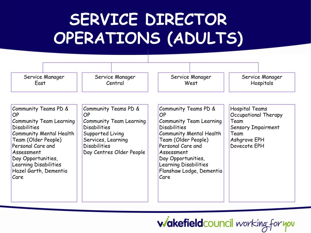 SERVICE DIRECTOR OPERATIONS (ADULTS) Service Manager East Service Manager Central Service Manager West Service Manager Hospitals Community Teams PD & OP Community Team Learning Disabilities Community Mental Health Team (Older People) Personal Care and Assessment Day Opportunities, Learning Disabilities Hazel Garth, Dementia Care Community Teams PD & OP Community Team Learning Disabilities Supported Living Services, Learning Disabilities Day Centres Older People Community Teams PD & OP Community Team Learning Disabilities Community Mental Health Team (Older People) Personal Care and Assessment Day Opportunities, Learning Disabilities Flanshaw Lodge, Dementia Care Hospital Teams Occupational Therapy Team Sensory Impairment Team Ashgrove EPH Dovecote EPH