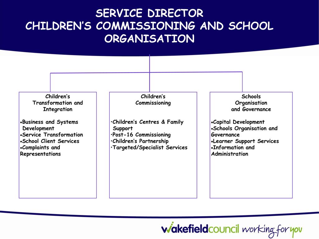 SERVICE DIRECTOR CHILDREN’S COMMISSIONING AND SCHOOL ORGANISATION • Children’s • Transformation and Integration • Business and Systems Development • Service Transformation • School Client Services • Complaints and Representations • Children’s • Commissioning • Children’s Centres & Family • Support • Post-16 Commissioning • Children’s Partnership • Targeted/Specialist Services • Schools • Organisation • and Governance • Capital Development • Schools Organisation and Governance • Learner Support Services • Information and Administration