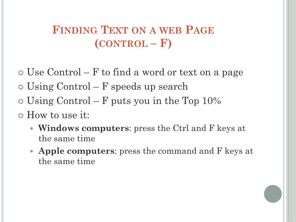 Finding Text on a web Page(control – F) • Use Control – F to find a word or text on a page • Using Control – F speeds up search • Using Control – F puts you in the Top 10% • How to use it: • Windows computers: press the Ctrl and F keys at the same time • Apple computers: press the command and F keys at the same time