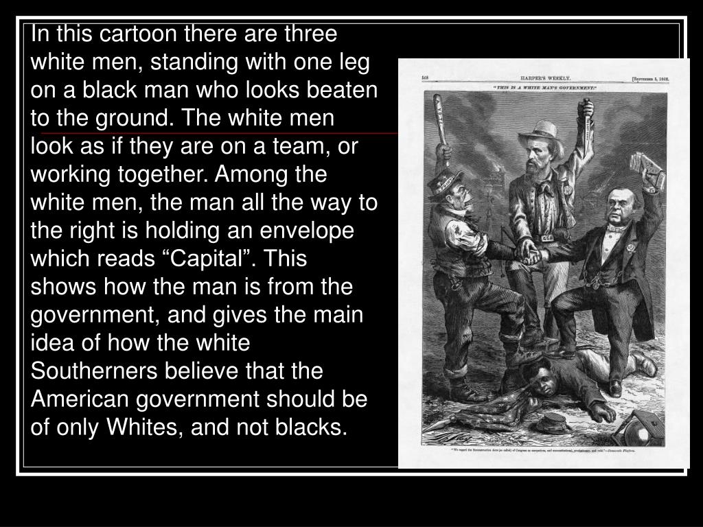 In this cartoon there are three white men, standing with one leg on a black man who looks beaten to the ground. The white men look as if they are on a team, or working together. Among the white men, the man all the way to the right is holding an envelope which reads “Capital”. This shows how the man is from the government, and gives the main idea of how the white Southerners believe that the American government should be of only Whites, and not blacks.