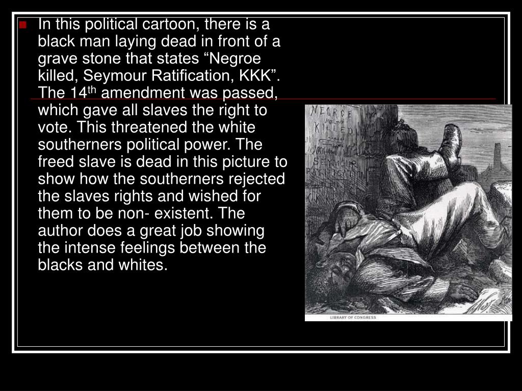 In this political cartoon, there is a black man laying dead in front of a grave stone that states “Negroe killed, Seymour Ratification, KKK”. The 14th amendment was passed, which gave all slaves the right to vote. This threatened the white southerners political power. The freed slave is dead in this picture to show how the southerners rejected the slaves rights and wished for them to be non- existent. The author does a great job showing the intense feelings between the blacks and whites.