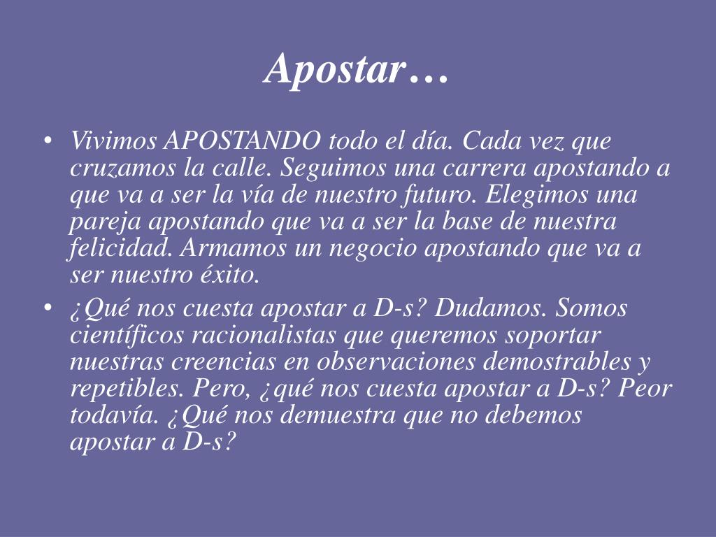 Apostar… • Vivimos APOSTANDO todo el día. Cada vez que cruzamos la calle. Seguimos una carrera apostando a que va a ser la vía de nuestro futuro. Elegimos una pareja apostando que va a ser la base de nuestra felicidad. Armamos un negocio apostando que va a ser nuestro éxito. • ¿Qué nos cuesta apostar a D-s? Dudamos. Somos científicos racionalistas que queremos soportar nuestras creencias en observaciones demostrables y repetibles. Pero, ¿qué nos cuesta apostar a D-s? Peor todavía. ¿Qué nos demuestra que no debemos apostar a D-s?