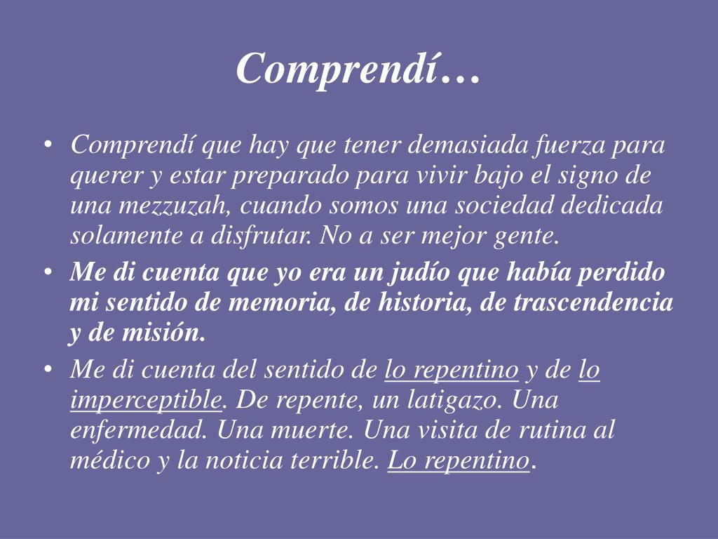 Comprendí… • Comprendí que hay que tener demasiada fuerza para querer y estar preparado para vivir bajo el signo de una mezzuzah, cuando somos una sociedad dedicada solamente a disfrutar. No a ser mejor gente. • Me di cuenta que yo era un judío que había perdido mi sentido de memoria, de historia, de trascendencia y de misión. • Me di cuenta del sentido de lo repentino y de lo imperceptible. De repente, un latigazo. Una enfermedad. Una muerte. Una visita de rutina al médico y la noticia terrible. Lo repentino.