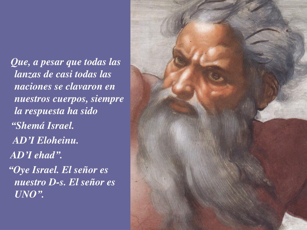 Que, a pesar que todas las lanzas de casi todas las naciones se clavaron en nuestros cuerpos, siempre la respuesta ha sido “Shemá Israel. AD’I Eloheinu. AD’I ehad”. “Oye Israel. El señor es nuestro D-s. El señor es UNO”.