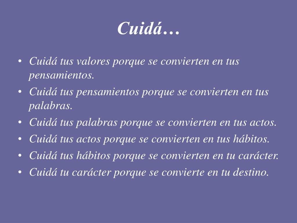 Cuidá… • Cuidá tus valores porque se convierten en tus pensamientos. • Cuidá tus pensamientos porque se convierten en tus palabras. • Cuidá tus palabras porque se convierten en tus actos. • Cuidá tus actos porque se convierten en tus hábitos. • Cuidá tus hábitos porque se convierten en tu carácter. • Cuidá tu carácter porque se convierte en tu destino.