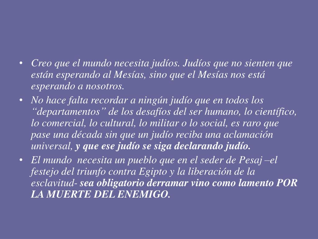 Creo que el mundo necesita judíos. Judíos que no sienten que están esperando al Mesías, sino que el Mesías nos está esperando a nosotros. • No hace falta recordar a ningún judío que en todos los “departamentos” de los desafíos del ser humano, lo científico, lo comercial, lo cultural, lo militar o lo social, es raro que pase una década sin que un judío reciba una aclamación universal, y que ese judío se siga declarando judío. • El mundo necesita un pueblo que en el seder de Pesaj –el festejo del triunfo contra Egipto y la liberación de la esclavitud- sea obligatorio derramar vino como lamento POR LA MUERTE DEL ENEMIGO.