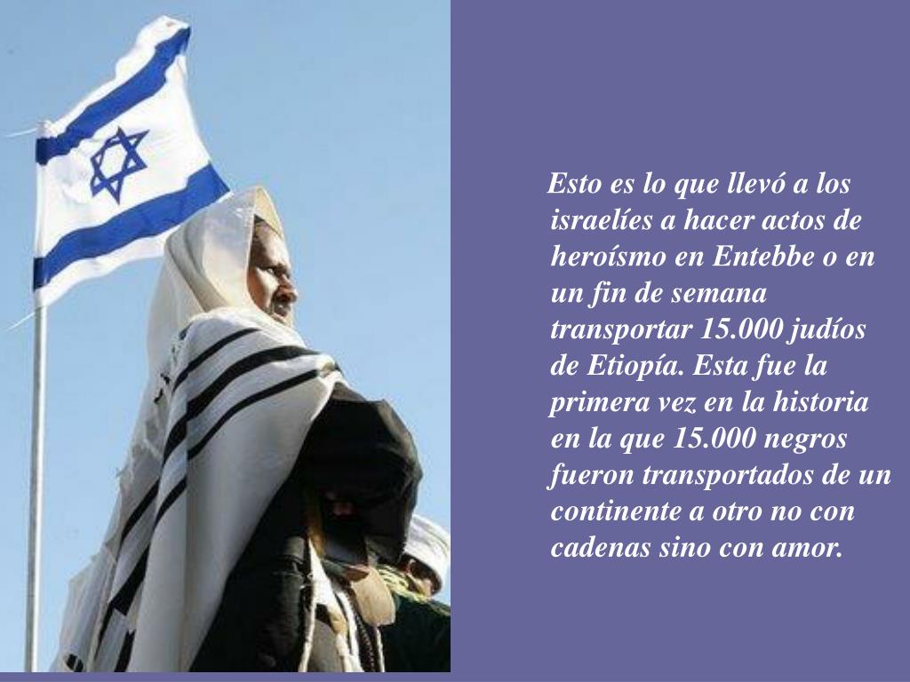 Esto es lo que llevó a los israelíes a hacer actos de heroísmo en Entebbe o en un fin de semana transportar 15.000 judíos de Etiopía. Esta fue la primera vez en la historia en la que 15.000 negros fueron transportados de un continente a otro no con cadenas sino con amor.