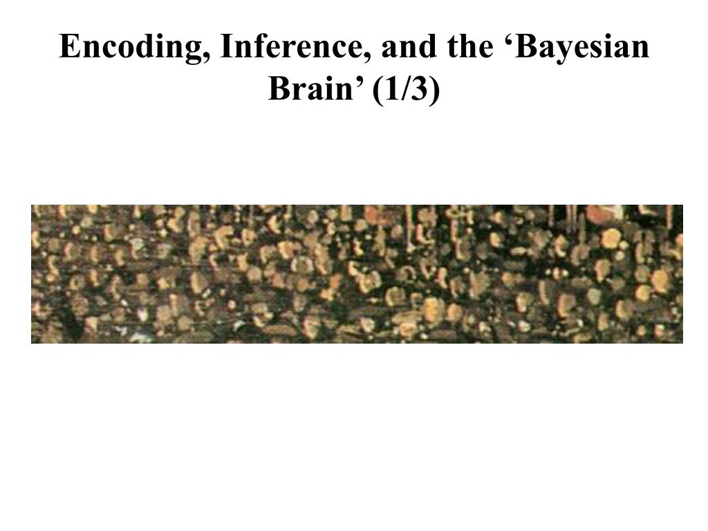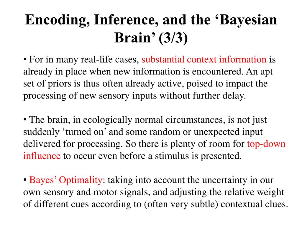 Encoding, Inference, and the ‘Bayesian Brain’ (3/3) • For in many real-life cases, substantial context information is already in place when new information is encountered. An apt set of priors is thus often already active, poised to impact the processing of new sensory inputs without further delay. • The brain, in ecologically normal circumstances, is not just suddenly ‘turned on’ and some random or unexpected input delivered for processing. So there is plenty of room for top-down influence to occur even before a stimulus is presented. • Bayes’ Optimality: taking into account the uncertainty in our own sensory and motor signals, and adjusting the relative weight of different cues according to (often very subtle) contextual clues.