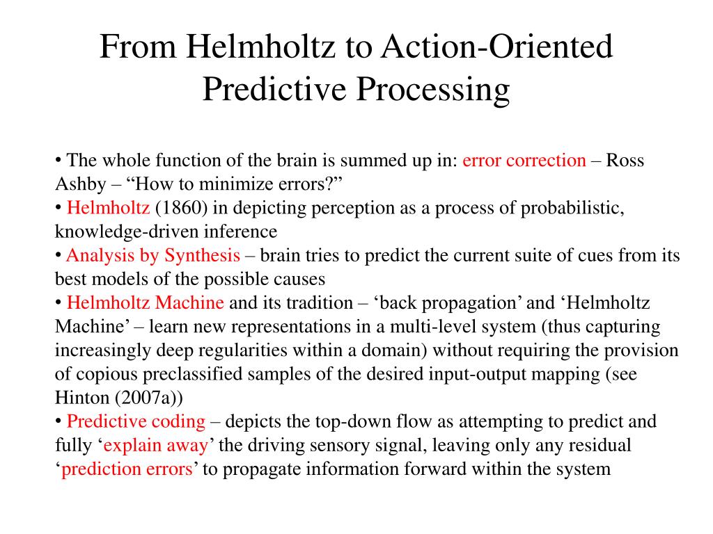 From Helmholtz to Action-Oriented Predictive Processing • The whole function of the brain is summed up in: error correction – Ross Ashby – “How to minimize errors?” • Helmholtz (1860) in depicting perception as a process of probabilistic, knowledge-driven inference • Analysis by Synthesis – brain tries to predict the current suite of cues from its best models of the possible causes • Helmholtz Machine and its tradition – ‘back propagation’ and ‘Helmholtz Machine’ – learn new representations in a multi-level system (thus capturing increasingly deep regularities within a domain) without requiring the provision of copious preclassified samples of the desired input-output mapping (see Hinton (2007a)) • Predictive coding – depicts the top-down flow as attempting to predict and fully ‘explain away’ the driving sensory signal, leaving only any residual ‘prediction errors’ to propagate information forward within the system