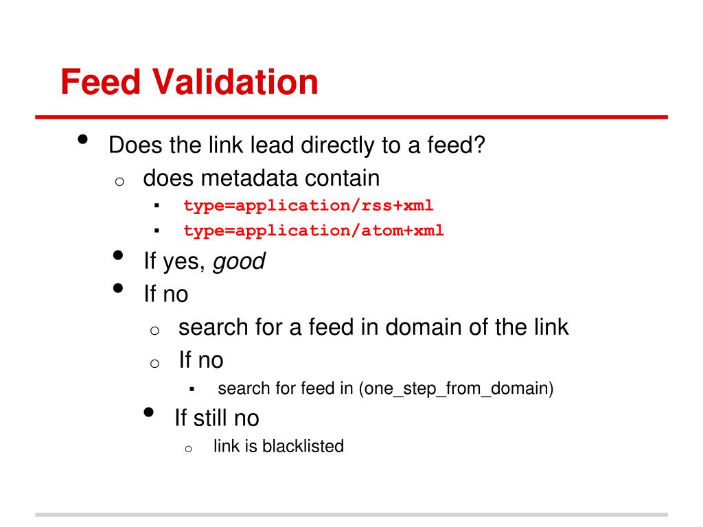Feed Validation • Does the link lead directly to a feed? • does metadata contain • type=application/rss+xml • type=application/atom+xml • If yes, good • If no • search for a feed in domain of the link • If no • search for feed in (one_step_from_domain) • If still no • link is blacklisted