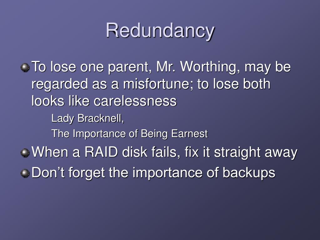 Redundancy • To lose one parent, Mr. Worthing, may be regarded as a misfortune; to lose both looks like carelessness Lady Bracknell, The Importance of Being Earnest • When a RAID disk fails, fix it straight away • Don’t forget the importance of backups