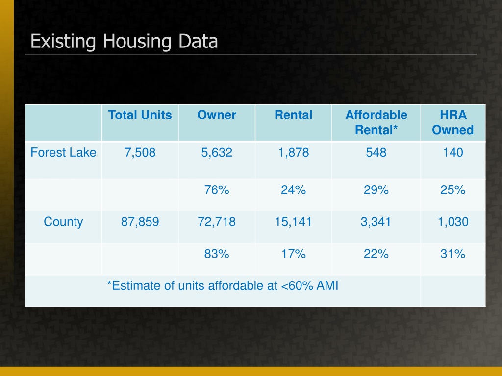 Regulatory Response to Affordable Housing • Adopted an Inclusionary Housing Ordinance • Purpose is to encourage and provide for the development of affordable housing within Forest Lake • Ensures a continued availability of a diverse supply of home ownership and rental opportunities for low to moderate income households in all new residential development