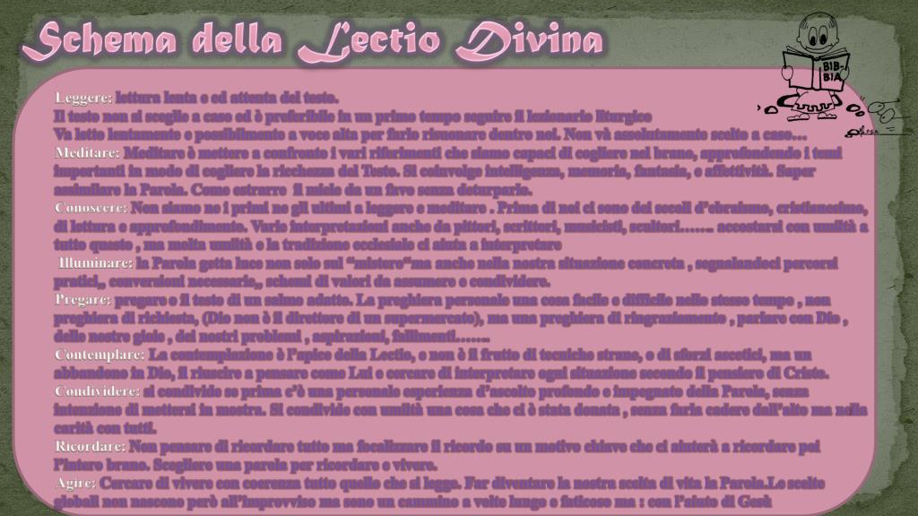 Schema della Lectio Divina Leggere: lettura lenta e ed attenta del testo. Il testo non si sceglie a caso ed è preferibile in un primo tempo seguire il lezionario liturgico Va letto lentamente e possibilmente a voce alta per farlo risuonare dentro noi. Non và assolutamente scelto a caso… Meditare: Meditare è mettere a confronto i vari riferimenti che siamo capaci di cogliere nel brano, approfondendo i temi importanti in modo di cogliere la ricchezza del Testo. Si coinvolge intelligenza, memoria, fantasia, e affettività. Saper assimilare la Parola. Come estrarre il miele da un favo senza deturparlo. Conoscere: Non siamo ne i primi ne gli ultimi a leggere e meditare . Prima di noi ci sono dei secoli d’ebraismo, cristianesimo, di lettura e approfondimento. Varie interpretazioni anche da pittori, scrittori, musicisti, scultori……. accostarsi con umiltà a tutto questo , ma molta umiltà e la tradizione ecclesiale ci aiuta a interpretare Illuminare: la Parola getta luce non solo sul “mistero“ma anche nella nostra situazione concreta , segnalandoci percorsi pratici,, conversioni necessarie,, schemi di valori da assumere e condividere. Pregare: pregare o il testo di un salmo adatto. La preghiera personale una cosa facile e difficile nello stesso tempo , non preghiera di richiesta, (Dio non è il direttore di un supermercato), ma una preghiera di ringraziamento , parlare con Dio , delle nostre gioie , dei nostri problemi , aspirazioni, fallimenti……. Contemplare: La contemplazione è l’apice della Lectio, e non è il frutto di tecniche strane, o di sforzi ascetici, ma un abbandono in Dio, il riuscire a pensare come Lui e cercare di interpretare ogni situazione secondo il pensiero di Cristo. Condividere: si condivide se prima c’è una personale esperienza d’ascolto profondo e impegnato della Parola, senza intenzione di mettersi in mostra. Si condivide con umiltà una cosa che ci è stata donata , senza farla cadere dall’alto ma nella carità con tutti. Ricordare: Non pensare di ricordare tutto ma focalizzare il ricordo su un motivo chiave che ci aiuterà a ricordare poi l’intero brano. Scegliere una parola per ricordare e vivere. Agire: Cercare di vivere con coerenza tutto quello che si legge. Far diventare la nostra scelta di vita la Parola.Le scelte globali non nascono però all’improvviso ma sono un cammino a volte lungo e faticoso ma : con l’aiuto di Gesù .