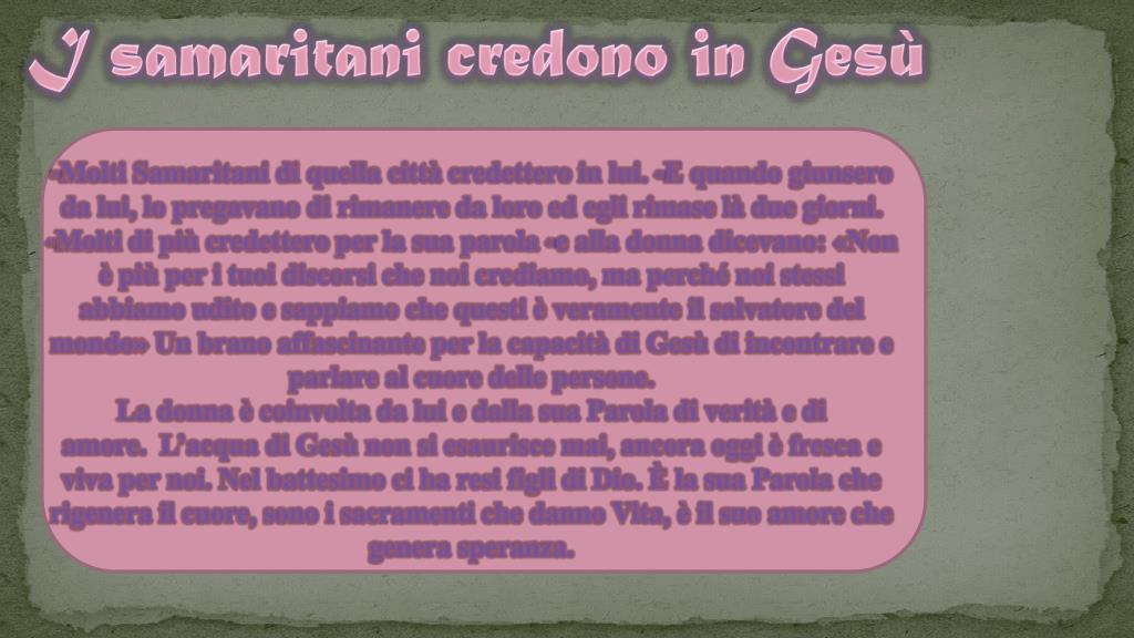 I samaritani credono in Gesù 39Molti Samaritani di quella città credettero in lui.40E quando giunsero da lui, lo pregavano di rimanere da loro ed egli rimase là due giorni. 41Molti di più credettero per la sua parola 42e alla donna dicevano: «Non è più per i tuoi discorsi che noi crediamo, ma perché noi stessi abbiamo udito e sappiamo che questi è veramente il salvatore del mondo»Un brano affascinante per la capacità di Gesù di incontrare e parlare al cuore delle persone. La donna è coinvolta da lui e dalla sua Parola di verità e di amore. L’acqua di Gesù non si esaurisce mai, ancora oggi è fresca e viva per noi. Nel battesimo ci ha resi figli di Dio. È la sua Parola che rigenera il cuore, sono i sacramenti che danno Vita, è il suo amore che genera speranza.