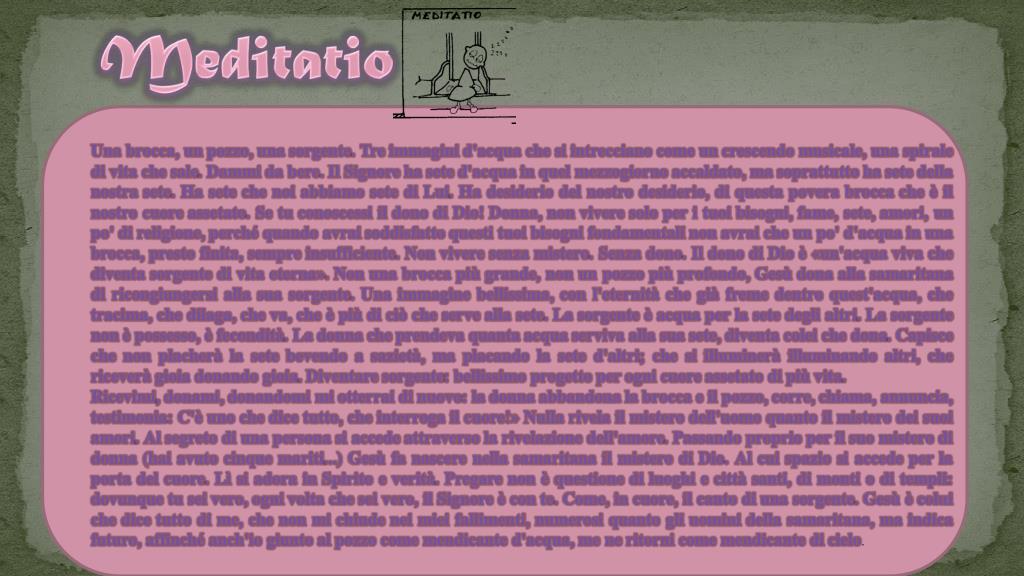 Oratio È toccato anche a me, Gesù: un giorno ti ho incontrato come un povero, come un assetato, come un viandante stanco che chiede aiuto. Hai dovuto vincere le mie reticenze, i miei sospetti ed i miei dubbi per offrirmi una possibilità nuova: un’acqua che zampilla per la vita eterna. Un po’ alla volta tu mi hai aperto gli occhi sulla mia esistenza, mi hai fatto riconoscere i miei fallimenti e le mie ferite, i miei peccati e le mie infedeltà. Tu mi hai condotto all’essenziale, a quello che conta veramente e ti sei rivelato come l’Inviato di Dio, il Messia, il suo Cristo. È toccato anche a me, Signore, ad uno dei pozzi della storia di incontrarti e di riconoscerti come il Salvatore, come l’Unico capace di colmare la mia sete più profonda. Aspettaci, Signore, al pozzo dell’incontro, nell’ora provvidenziale che scocca per ognuno. Presèntati e parlaci per primo, tu mendicante ricco dell’unica acqua viva. Distoglici, pian piano, da tanti desideri, da tanti amori effimeri che ancora ci trattengono. Riportaci in noi stessi, nel centro più segreto dove nessun altro giunge. Tra le dure pietre dell’orgoglio, il fango dei compromessi, la sabbia dei rimandi, scava tu stesso un varco al tuo Santo Spirito. Amen.