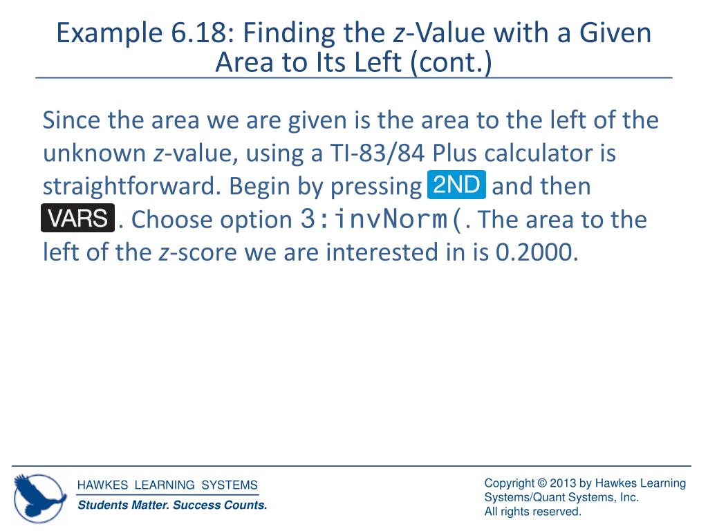 Example 6.18: Finding the z-Value with a Given Area to Its Left (cont.) Since the area we are given is the area to the left of the unknown z-value, using a TI-83/84 Plus calculator is straightforward. Begin by pressing and then . Choose option 3:invNorm(. The area to the left of the z-score we are interested in is 0.2000.
