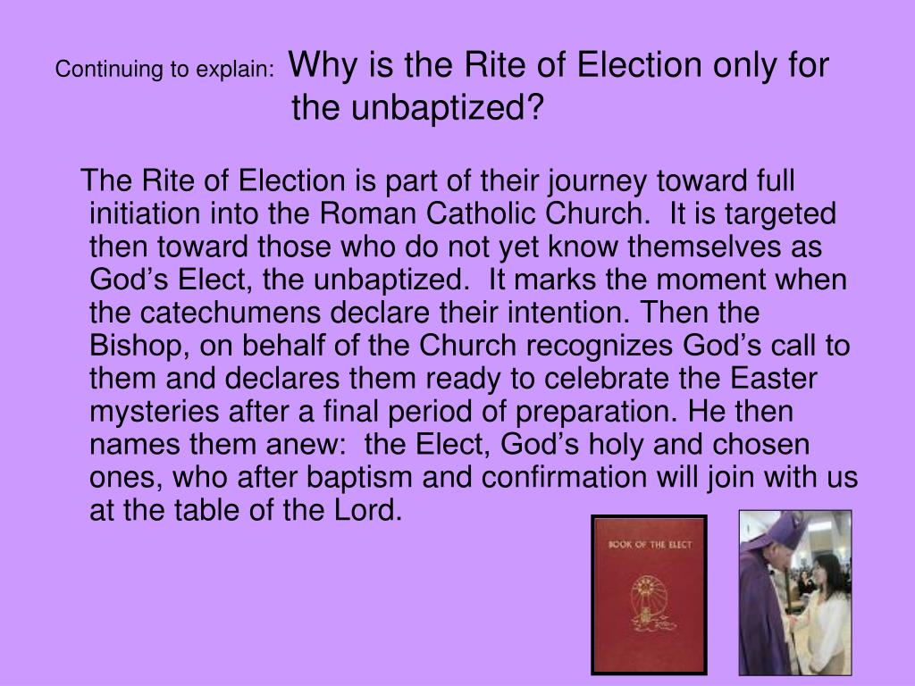 PART TWOWhy is the Rite of Election only for the unbaptized? The theology of election is anchored in the idea of God having a holy and chosen people, those known as his elect. Baptism is the sacramental ritual that marks the beginning of our covenant relationship with God as a chosen son or daughter. Therefore, those who are already baptized are among God’s holy and chosen ones, God’s elect, even if they have not yet explored the dignity and meaning of that baptism. **