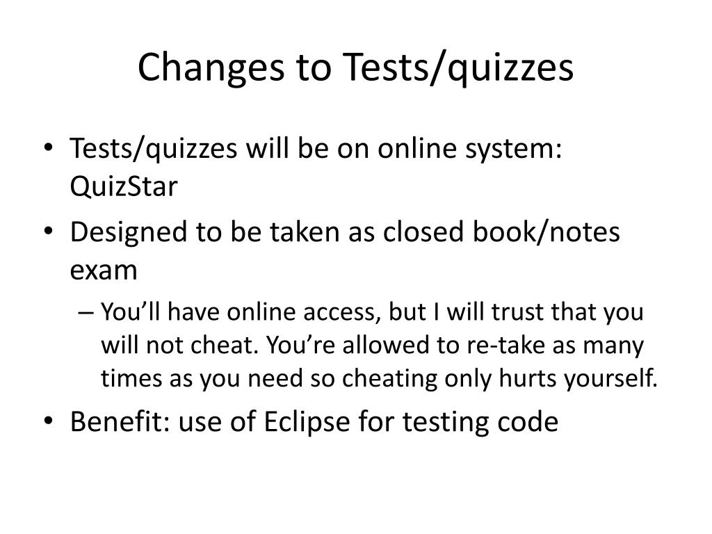 Changes to Tests/quizzes • Tests/quizzes will be on online system: QuizStar • Designed to be taken as closed book/notes exam • You’ll have online access, but I will trust that you will not cheat. You’re allowed to re-take as many times as you need so cheating only hurts yourself. • Benefit: use of Eclipse for testing code