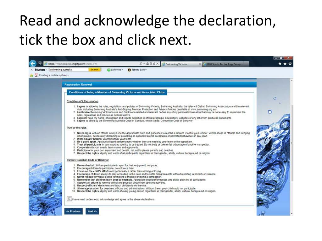 Click on ‘Member Portal’. Click on ‘New Registration’. Select ‘Swimmer’ if signing up as a competitive member ($145.50) or Select ‘Non-Competitive Swimmer’ if signing up for non-competitive squad ($60) C lick next. Read and acknowledge the declaration, tick the box and click next.