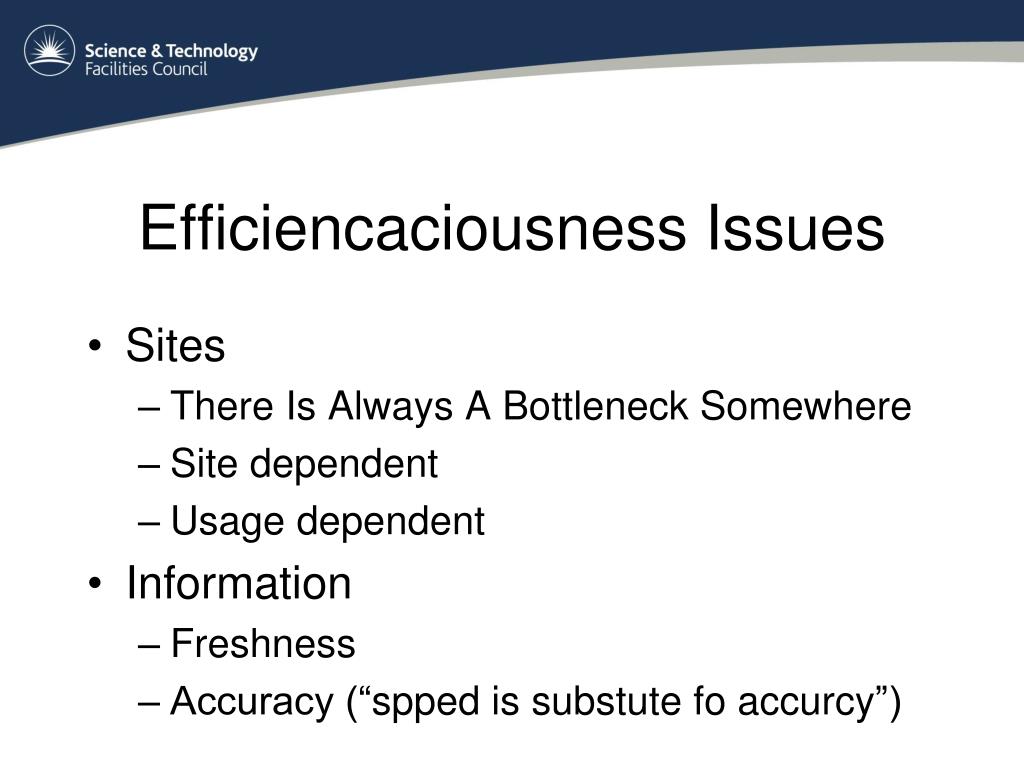 Efficiencaciousness Issues • Sites • There Is Always A Bottleneck Somewhere • Site dependent • Usage dependent • Information • Freshness • Accuracy (“spped is substutefoaccurcy”)