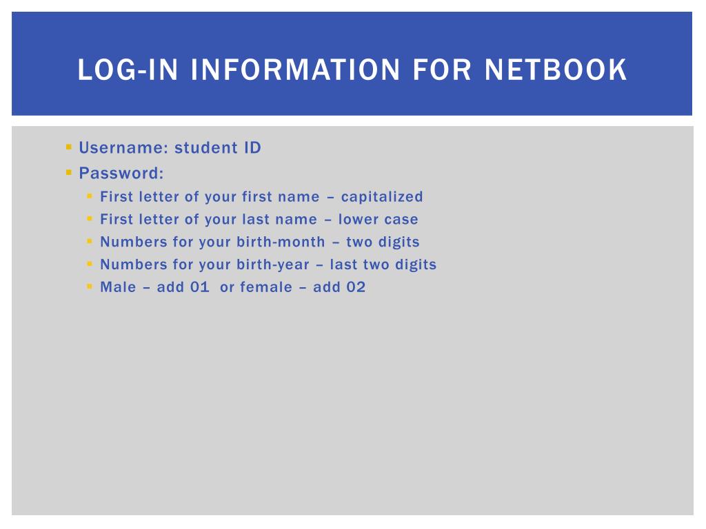 Log-in information for Netbook • Username: student ID • Password: • First letter of your first name – capitalized • First letter of your last name – lower case • Numbers for your birth-month – two digits • Numbers for your birth-year – last two digits • Male – add 01 or female – add 02