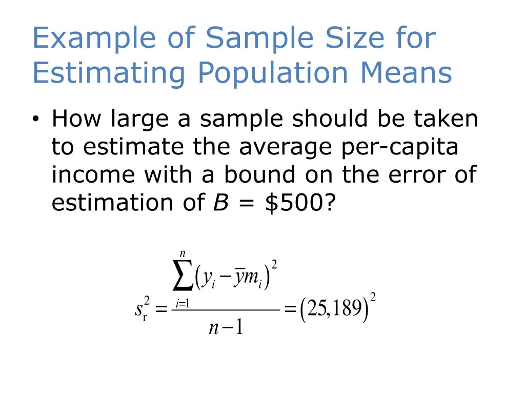 Example of Sample Size for Estimating Population Means How large a sample should be taken to estimate the average per-capita income with a bound on the error of estimation of B = $500?